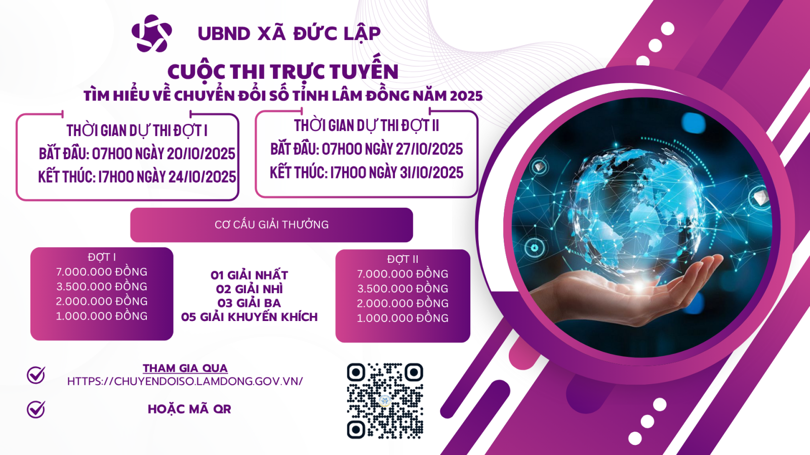 Ngày 18/10/2025, Ủy ban nhân dân xã Đức Lập nhận được Thông báo số 1643/TB-BTC của Ban tổ chức Cuộc thi trắc nghiệm trực tuyến tìm hiểu về chuyển đổi số tỉnh Lâm Đồng về Thông báo Tổ chức Cuộc thi trắc nghiệm trực tuyến tìm hiểu về Chuyển đổi số năm 2025