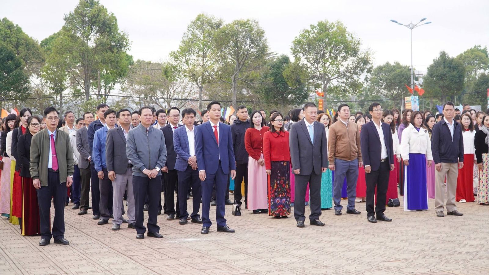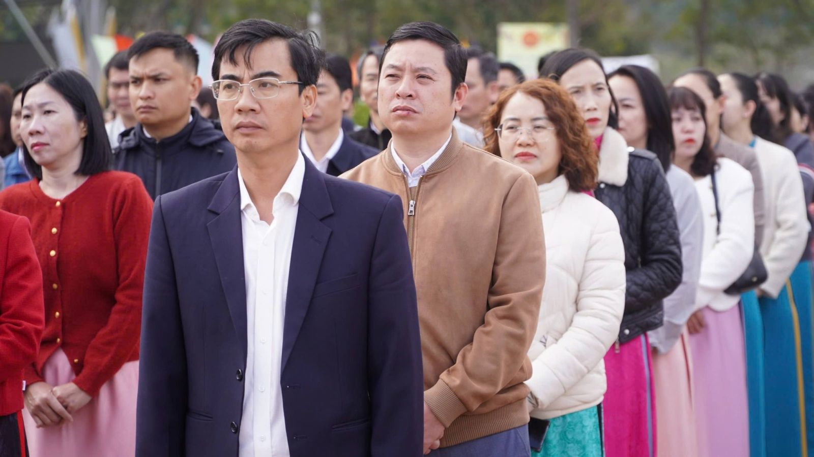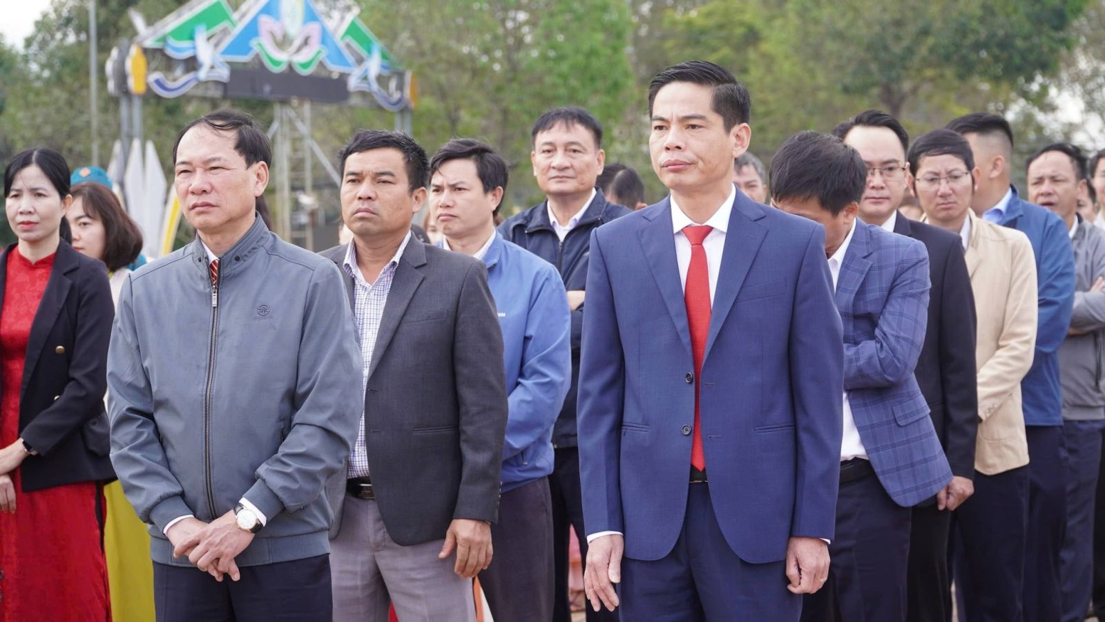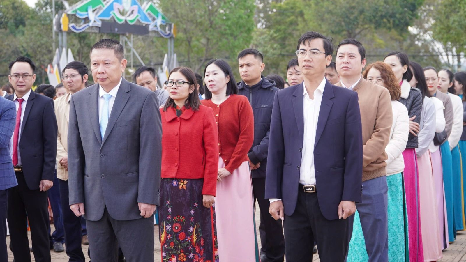 Trong không khí trang nghiêm, trọng thể, tiếng Quốc ca hào hùng vang lên, các đại biểu tham dự nghiêm trang thực hiện nghi thức chào cờ và hát Quốc ca.