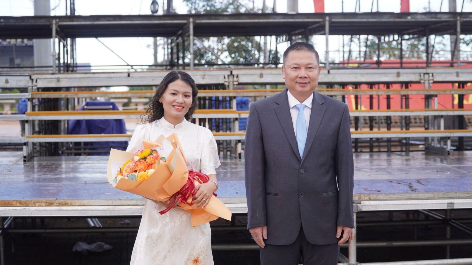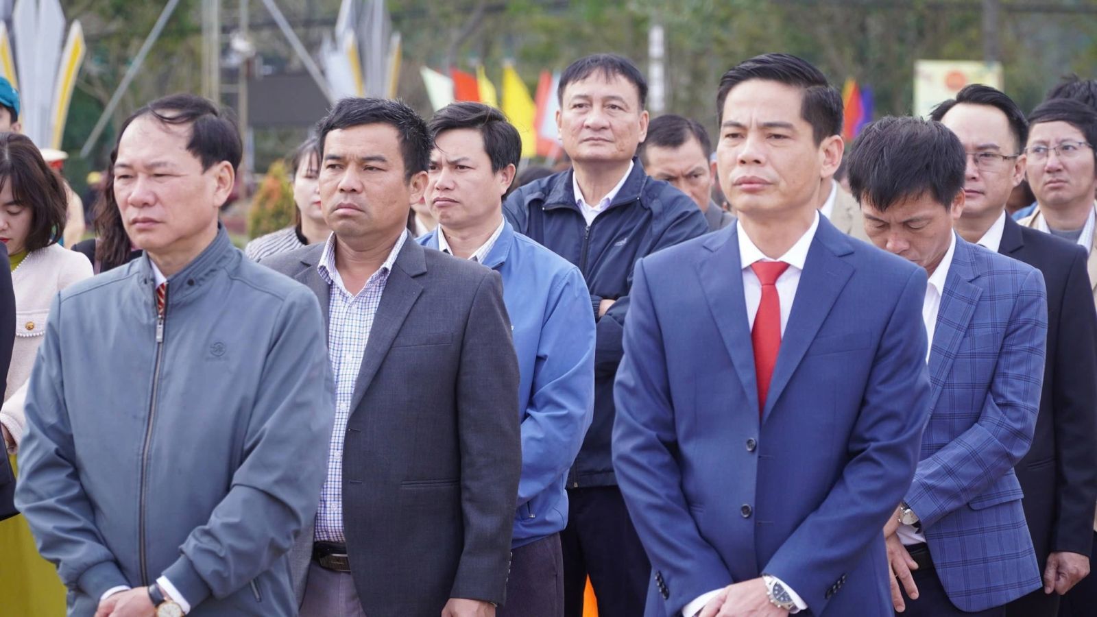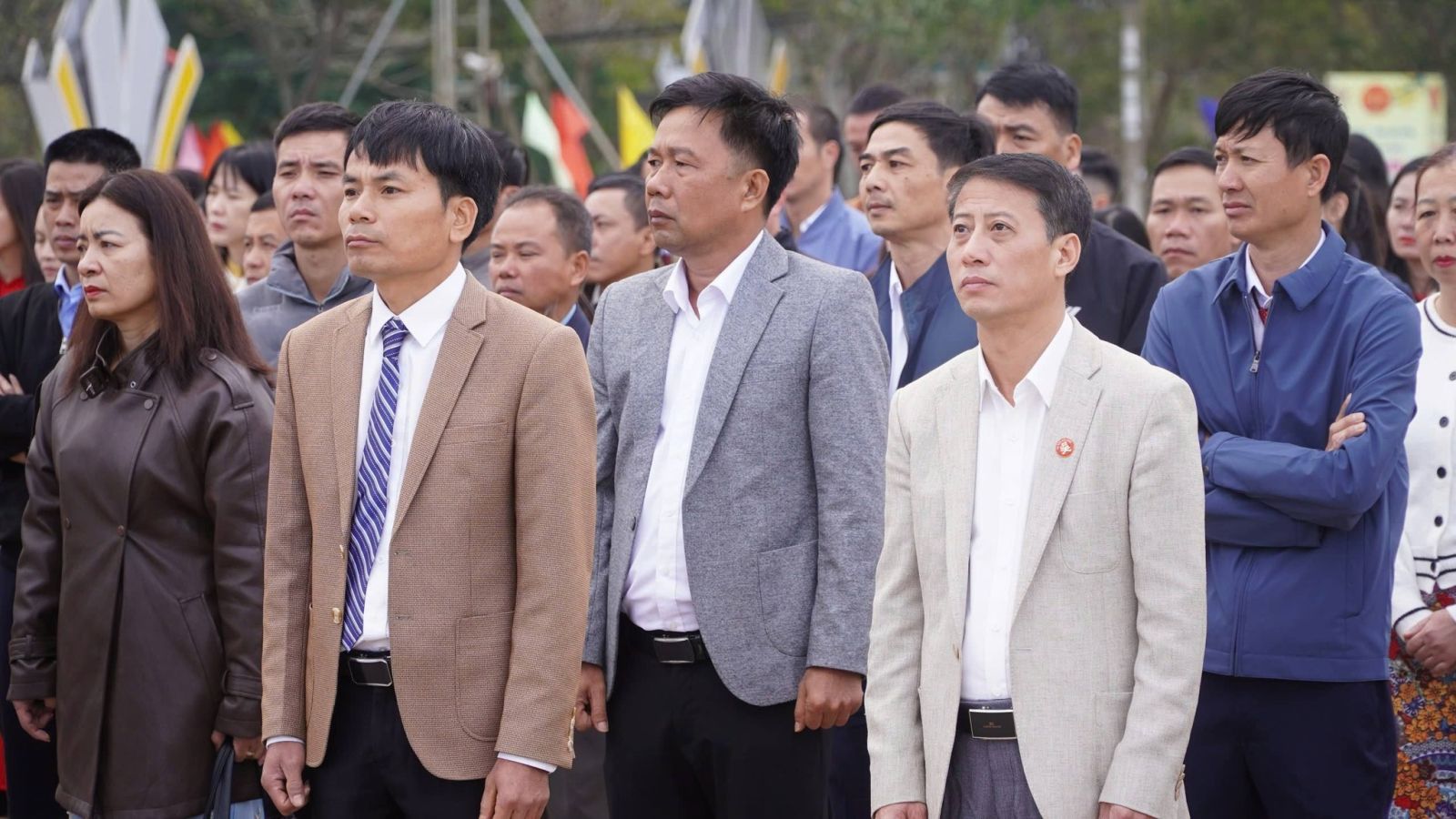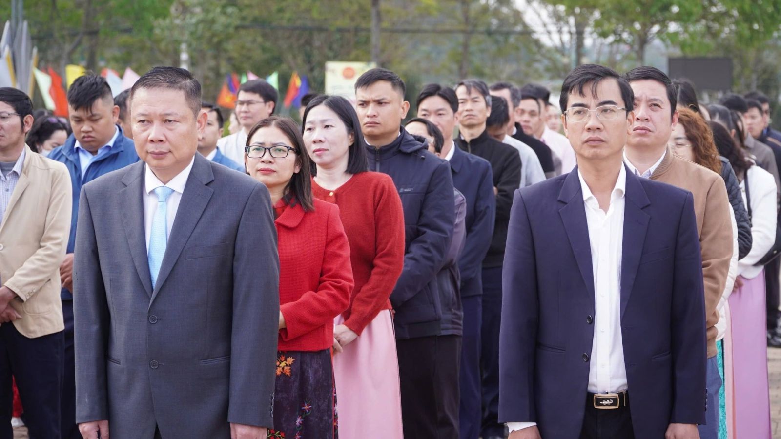 Trong không khí trang nghiêm, trọng thể, tiếng Quốc ca hào hùng vang lên, các đại biểu tham dự nghiêm trang thực hiện nghi thức chào cờ và hát Quốc ca.
