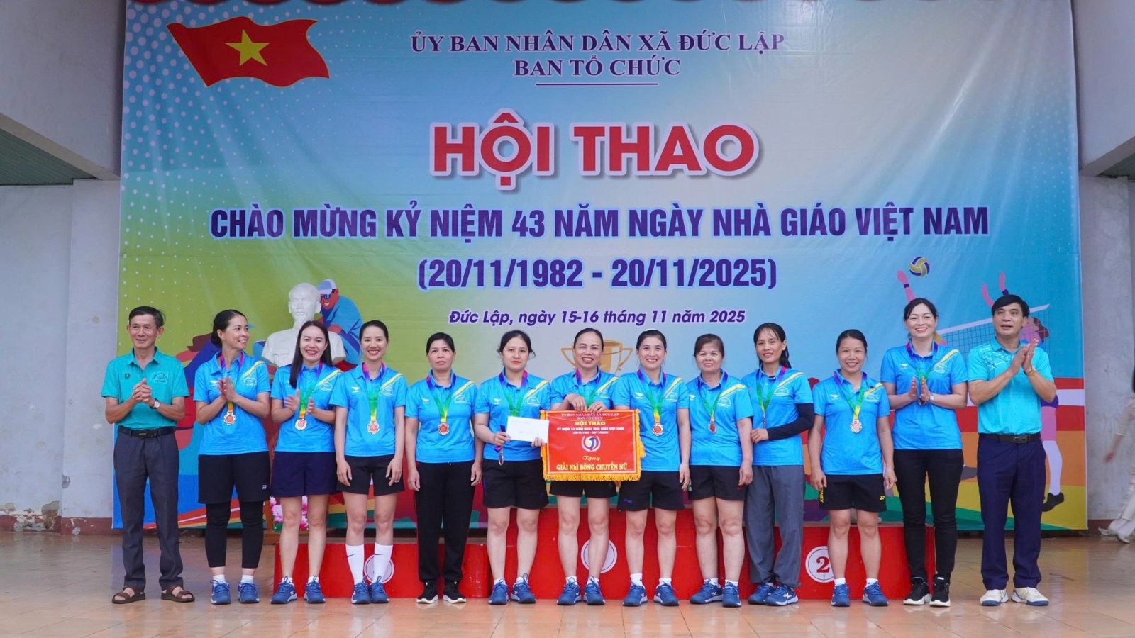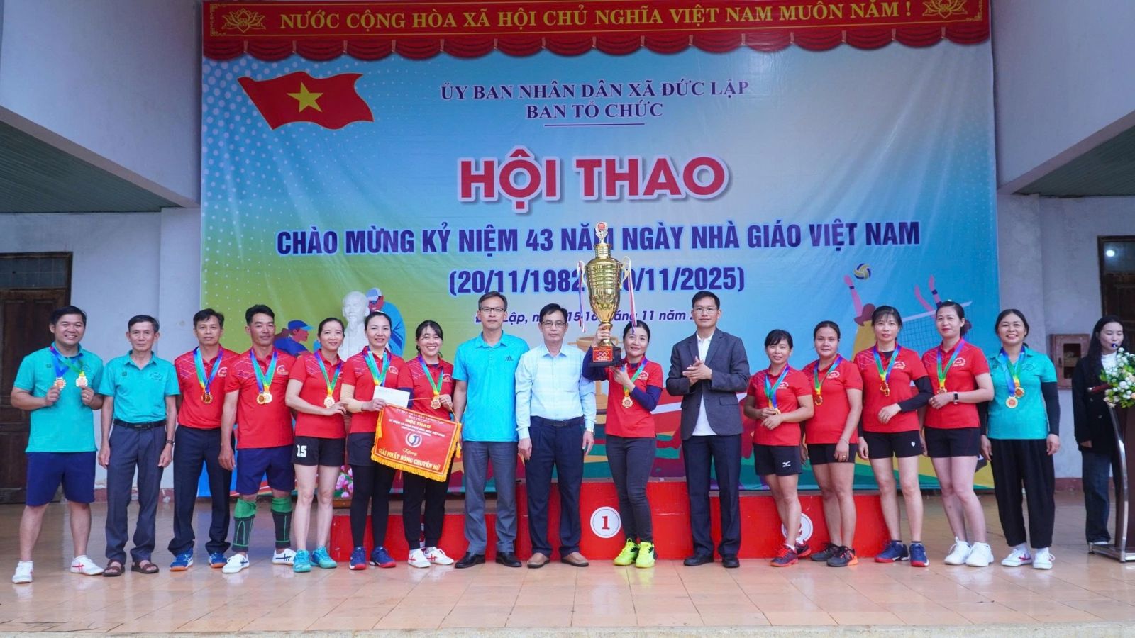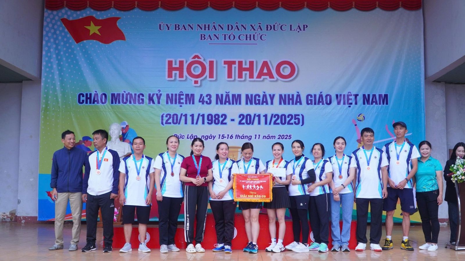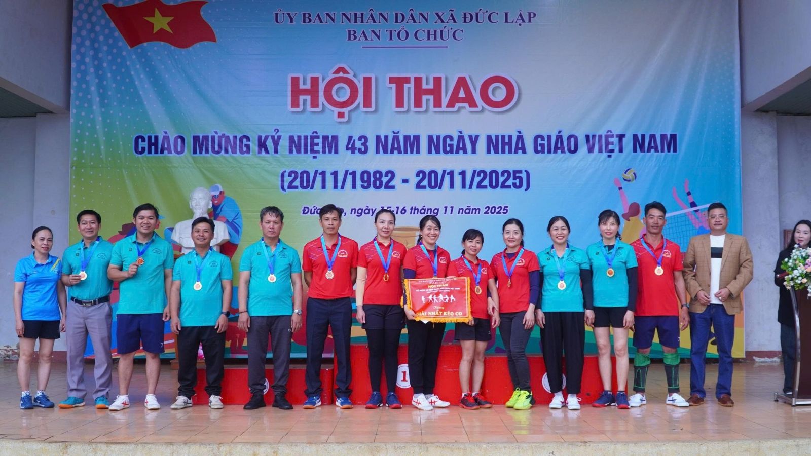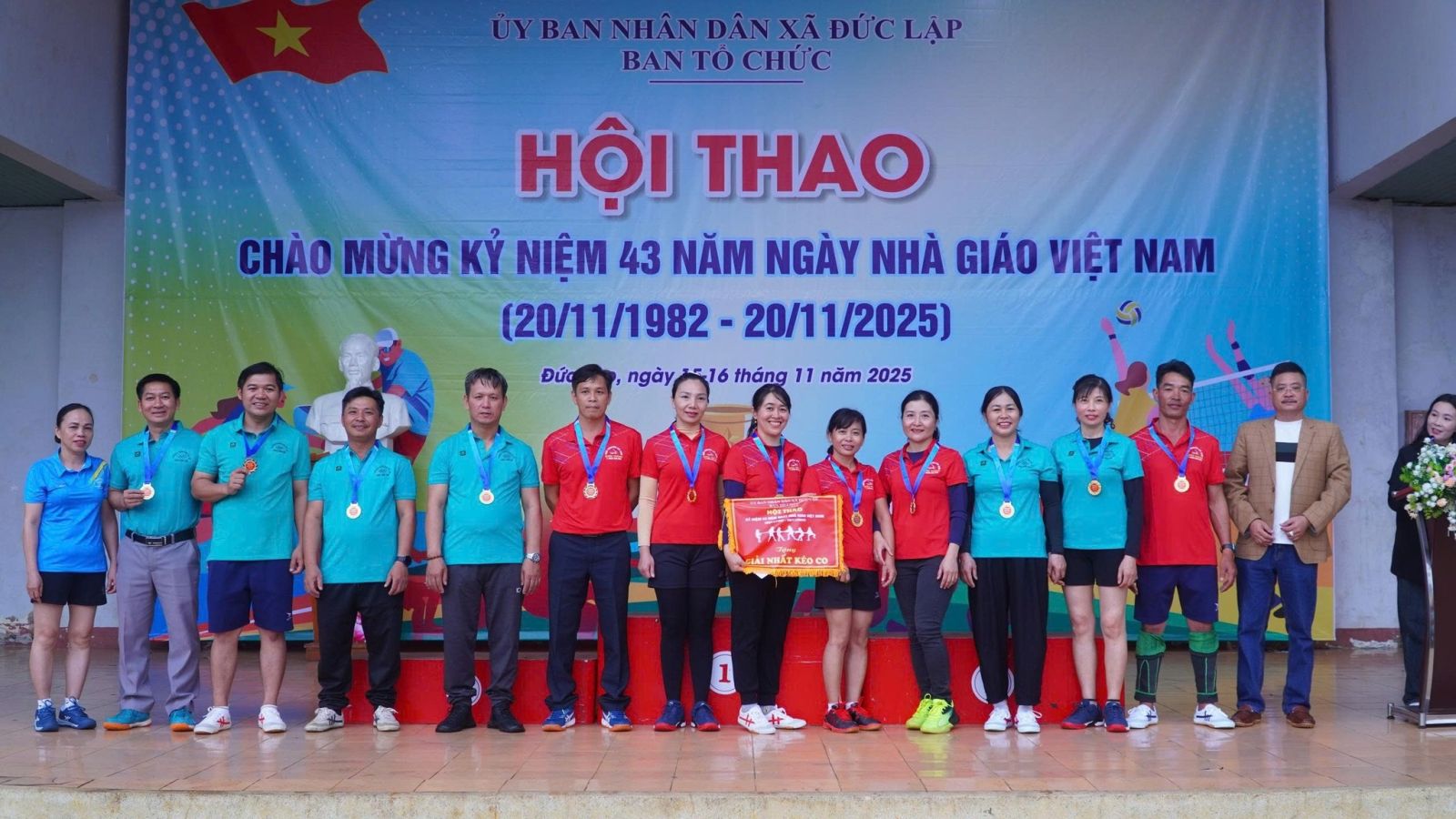 Sau 2 ngày thi đấu, hội thao chào mừng 43 năm ngày nhà giáo Việt Nam 20/11/1982 -20/11/2025 đã tìm ra được chủ nhân của các ngôi vị cao nhất. Dự bế mạc, trao giải có đồng chí Đồng chí Nguyễn Xuân Lương – UVBTV, PCT HĐND xã; Đồng chí Đinh Thanh Hải - UVBTV, PCT UBND Xã.
