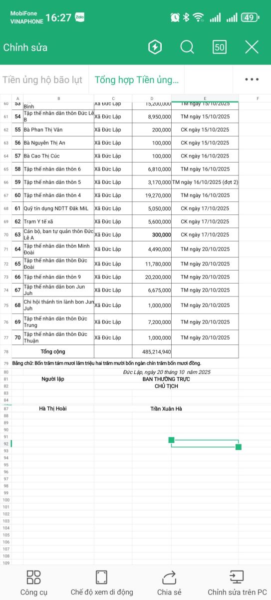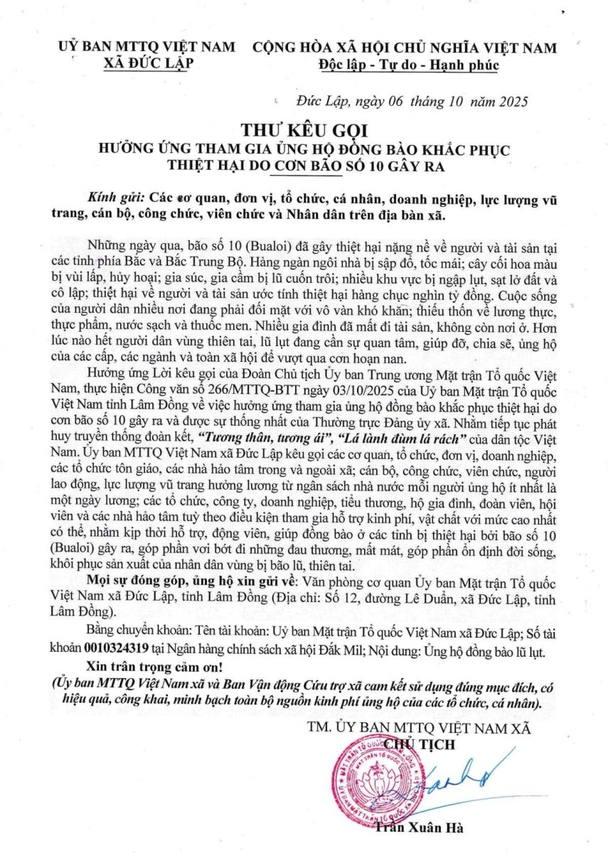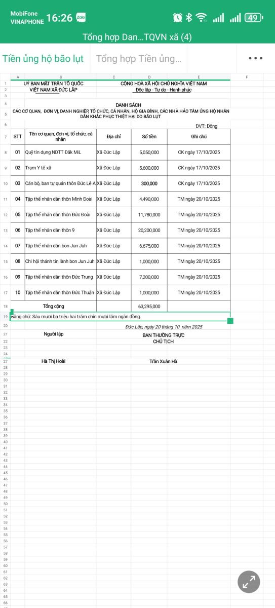 ỦY BAN MẶT TRẬN TỔ QUỐC VIỆT NAM XÃ ĐỨC LẬP CẬP NHẬT SỐ TIỀN ỦNG HỘ ĐỒNG BÀO BỊ ẢNH HƯỞNG THIÊN TAI TÍNH ĐẾN 16h00 NGÀY 20/ 10/2025